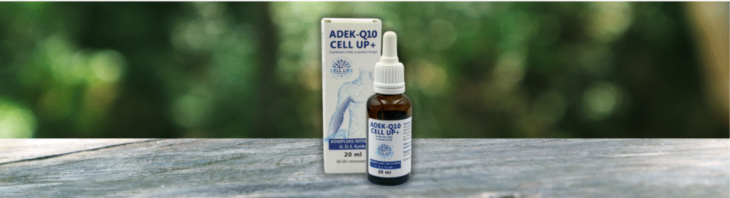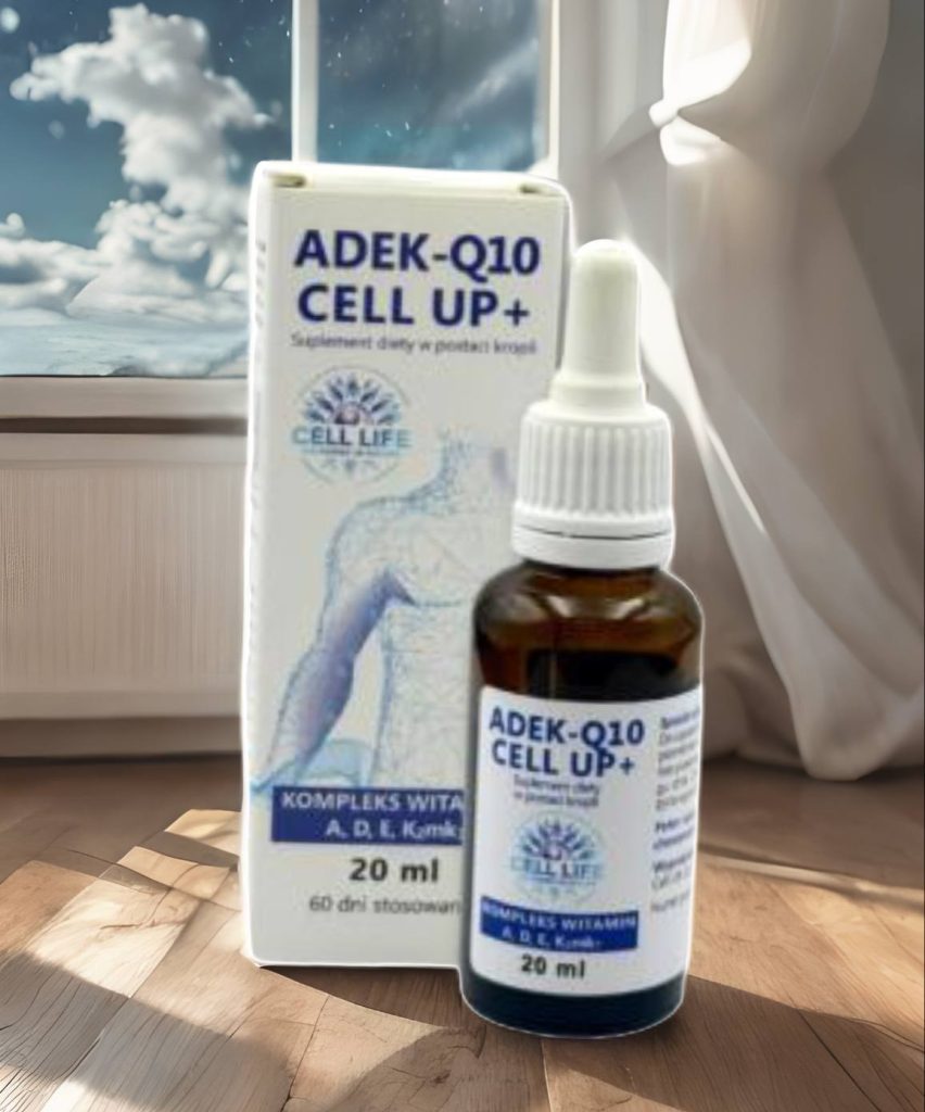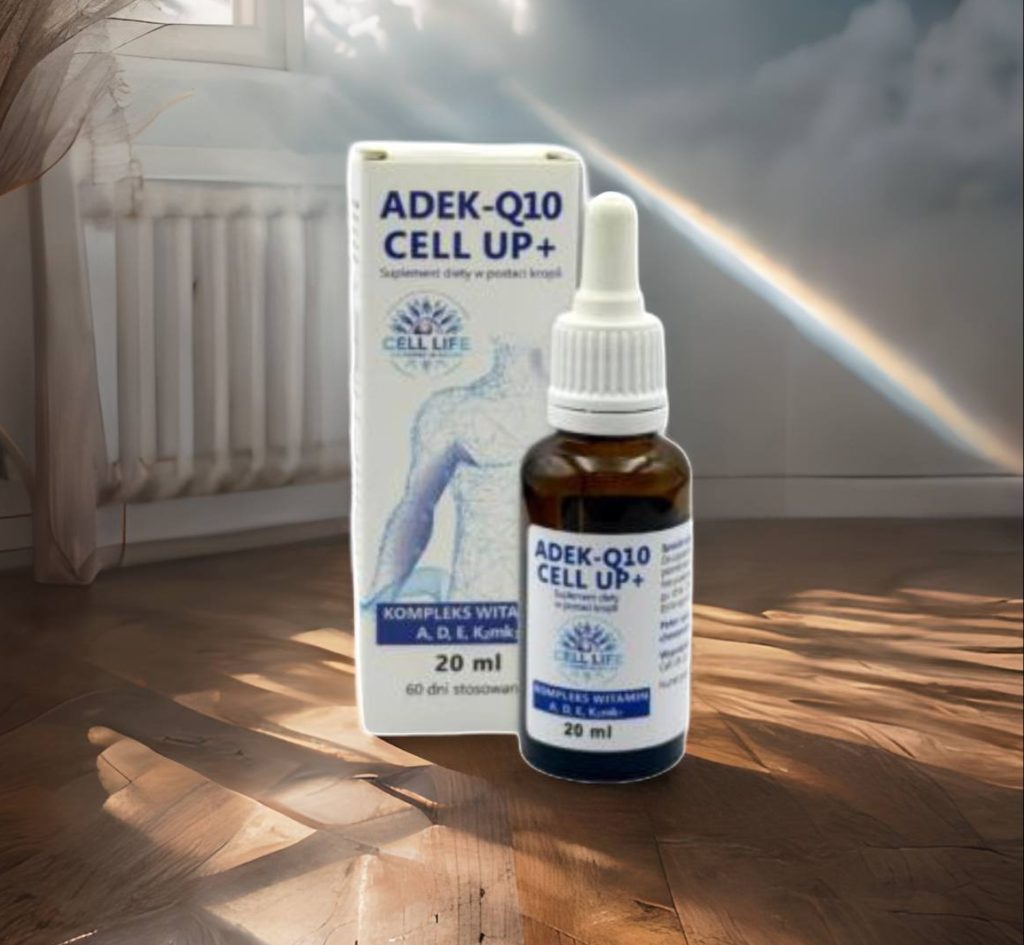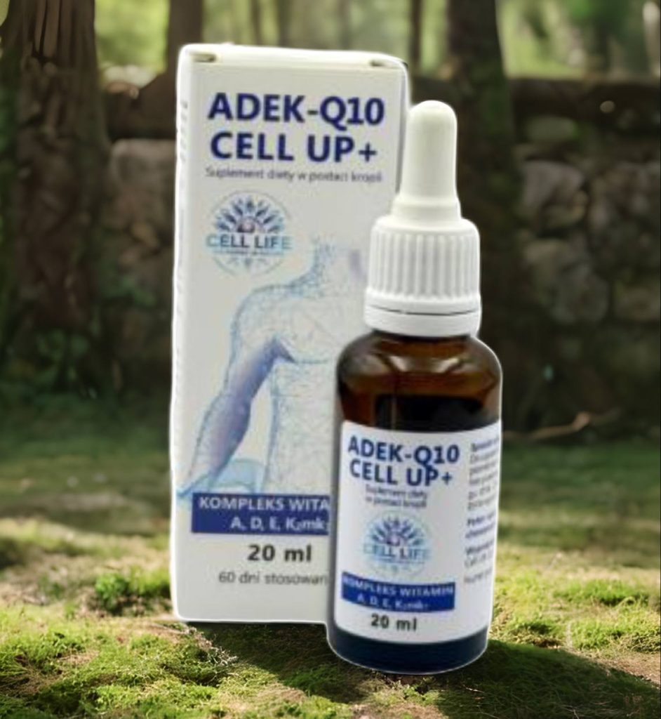 ADEK + Q10 Cell Up+ to suplement diety w płynnej formie, zawierający zestaw witamin rozpuszczalnych w tłuszczach: A, D, E, K, a także koenzym Q10. Składniki produktu takie jeak witamina D i witamina A wspierają m.in. prawidłowe funkcjonowanie układu odpornościowego, zdrowie kości i zębów, ochronę komórek przed stresem oksydacyjnym, prawidłowe widzenie oraz krzepnięcie krwi. Koenzym Q10 to związek naturalnie występujący w organizmie – obecny w mitochondriach komórek. Płynna forma ułatwia stosowanie oraz wchłanianie składników.